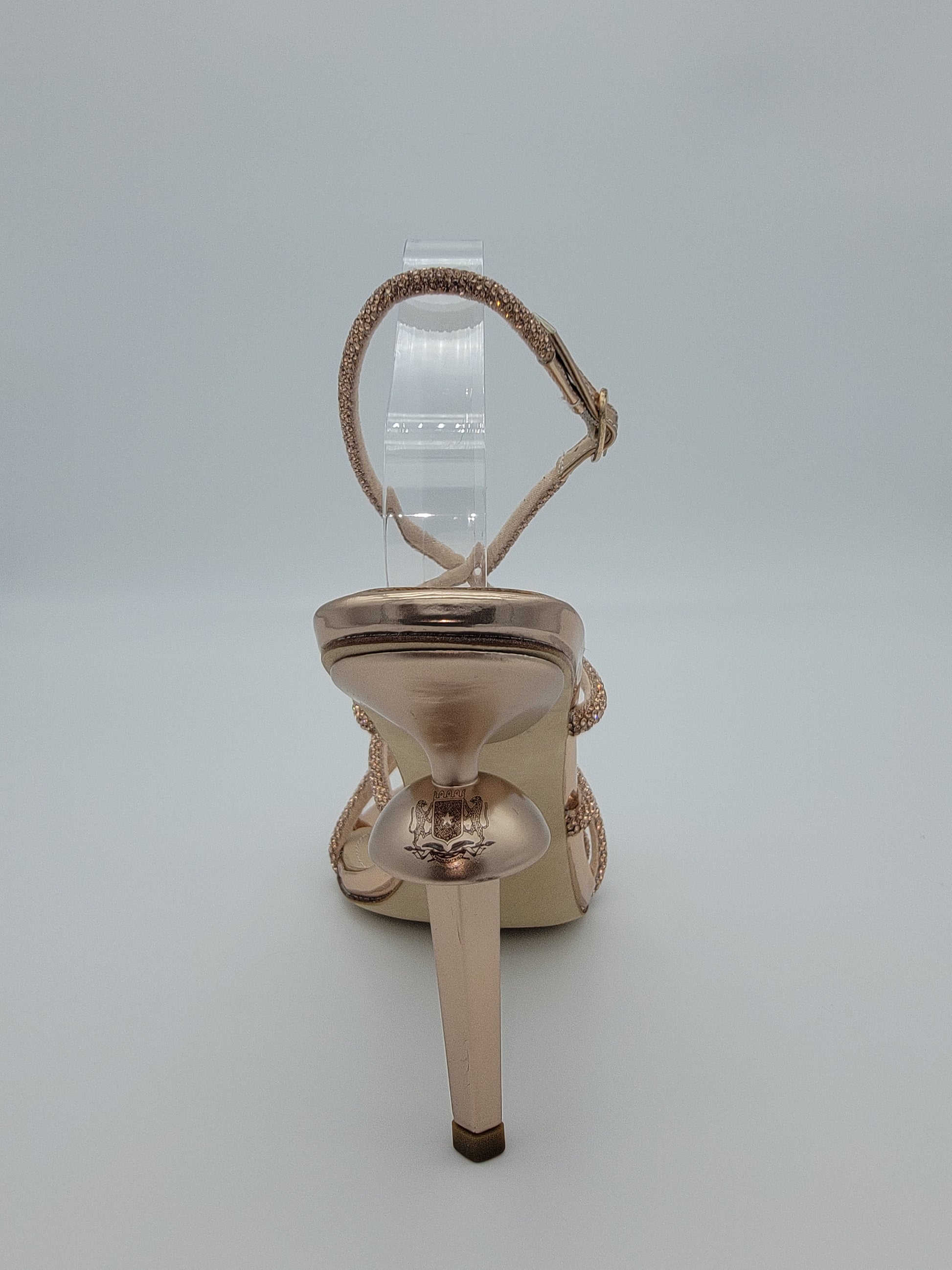 Step into effortless glamour with our Radiant Strappy Stiletto Heel, designed to turn heads with its dazzling sparkle and refined silhouette. This statement piece features multiple slender, glitter-embellished straps that beautifully frame the foot, paired with a sculptural metallic heel for a striking modern finish.